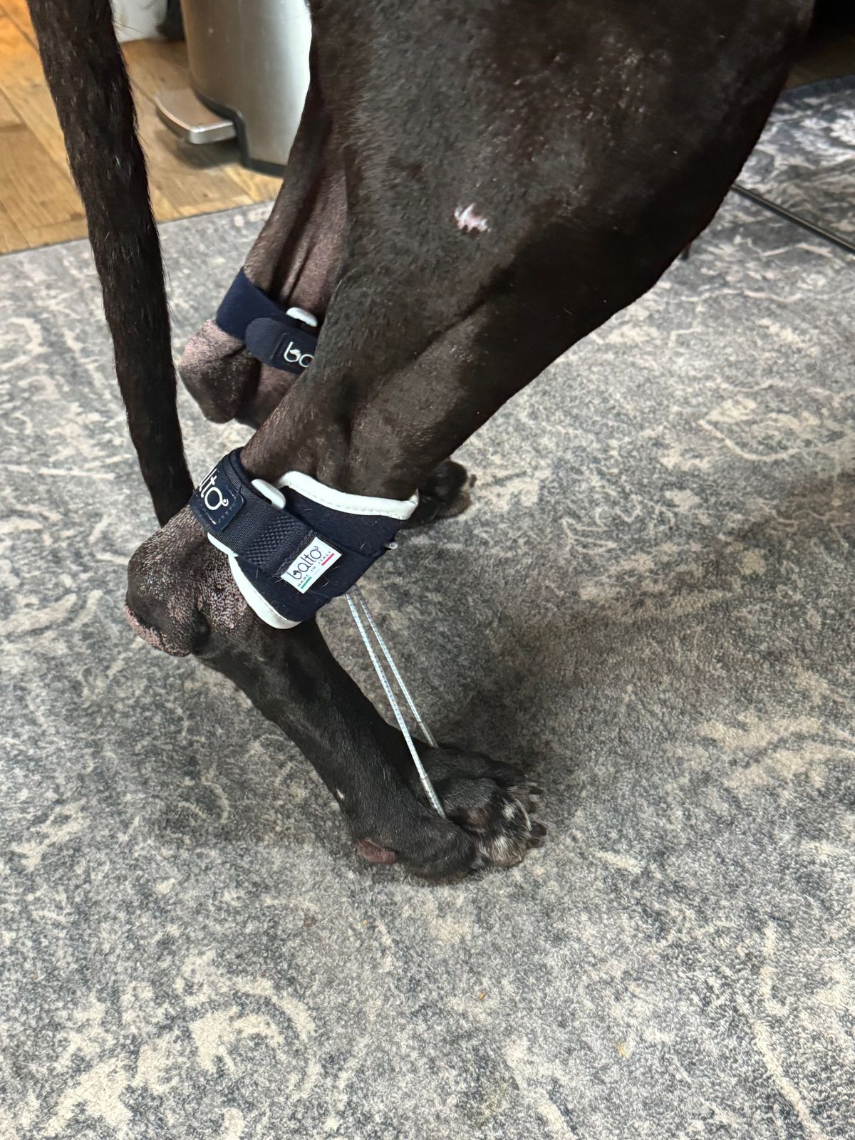 My 7 year old Dane has been knuckling for 4 months. Found these braces and decided to give them a try. They worked great! He wasn’t uncomfortable or trying to take them off either. He’s walking around more now. Definitely give these a try if your dog is knuckling